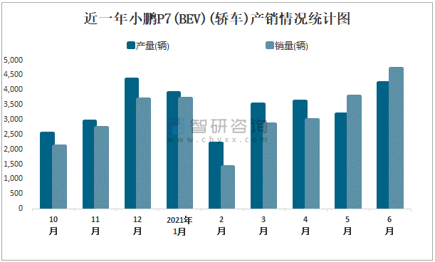 根據中國汽車工業協會數據可知:2021年6月小鵬P7(BEV)(轎車)產量為4247輛,同比增長473.1%,銷量為4730輛,同比下降0%,當月產銷率為111.37%;2021年上半年小鵬P7(BEV)(轎車)產量為20686輛,同比下降0%,銷量為19496輛,同比下降0%,產銷率為94.25%;且2020年小鵬P7(BEV)(轎車總產量大于總銷量,積壓了庫存3102輛。