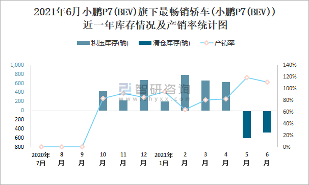 2021年6月小鵬P7(BEV)旗下最暢銷車(小鵬P7(BEV))近一年庫存情況及產銷率統計圖
