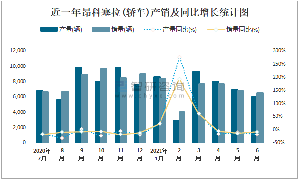 近一年昂科塞拉(轎車)產(chǎn)銷及同比增長統(tǒng)計(jì)圖