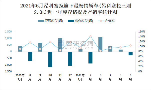 2021年6月昂科塞拉旗下最暢銷車(昂科塞拉三廂2.0L)近一年庫存情況及產(chǎn)銷率統(tǒng)計(jì)圖