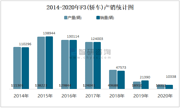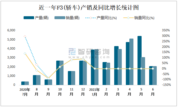 根據中國汽車工業協會數據可知:2021年6月F3(轎車)產量為2025輛,同比下降0%,銷量為2019輛,同比下降0%,當月產銷率為99.7%;2021年上半年F3(轎車)產量為22634輛,同比下降0%,銷量為20341輛,同比下降0%,產銷率為89.87%;2014-2020年F3(轎車)產銷量均在2015年達到最高值,此后逐年遞減,且近7年總銷量大于總產量,清倉庫存336輛。