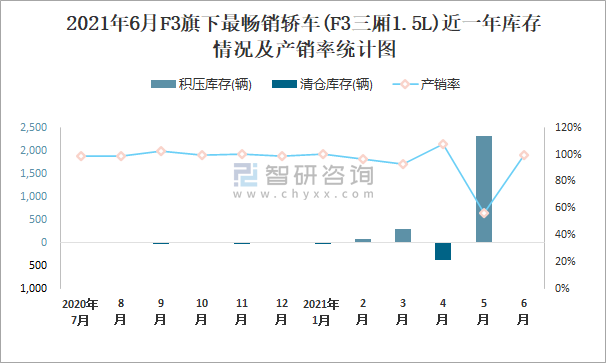 2021年6月F3旗下最暢銷車(F3三廂1.5L)近一年庫存情況及產銷率統計圖