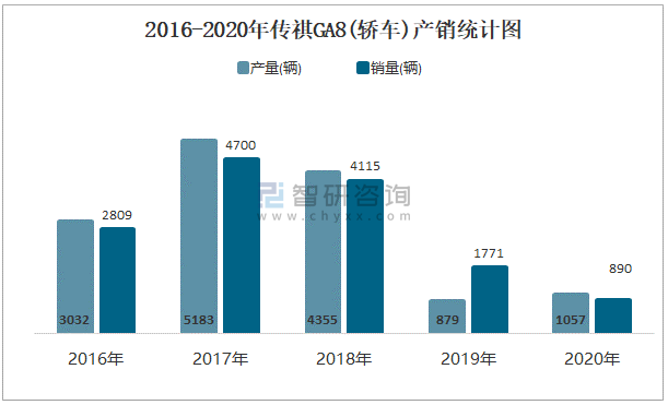 2016-2020年傳祺GA8(轎車)產(chǎn)銷統(tǒng)計圖