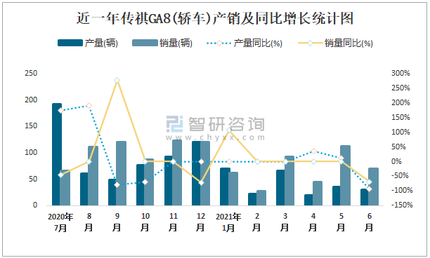 根據(jù)中國汽車工業(yè)協(xié)會數(shù)據(jù)可知:2021年6月傳祺GA8(轎車)產(chǎn)量為30輛,同比下降92.8%,銷量為70輛,同比下降69.4%,當(dāng)月產(chǎn)銷率為233.33%;2021年上半年傳祺GA8(轎車)產(chǎn)量為243輛,同比下降47.6%,銷量為409輛,同比增長56.7%,產(chǎn)銷率為168.31%;2016-2020年傳祺GA8(轎車)產(chǎn)銷量2017年達到最高值,此后逐年遞減,且近5年總產(chǎn)量大于總銷量,積壓了庫存221輛。