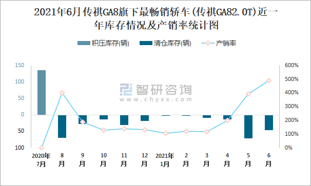 2021年6月傳祺GA8旗下最暢銷車(傳祺GA82.0T)近一年庫存情況及產(chǎn)銷率統(tǒng)計圖