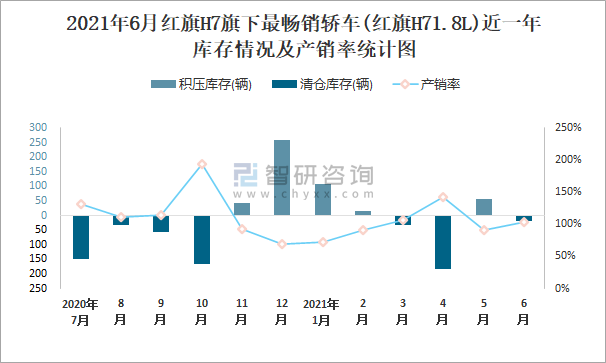 2021年6月紅旗H7旗下最暢銷車(紅旗H71.8L)近一年庫存情況及產銷率統計圖