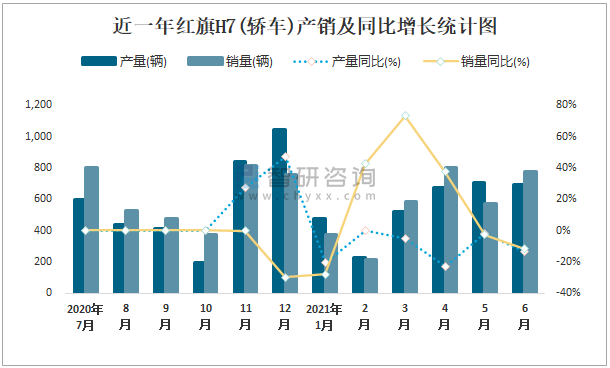 根據中國汽車工業協會數據可知:2021年6月紅旗H7(轎車)產量為694輛,同比下降13.3%,銷量為777輛,同比下降11.8%,當月產銷率為111.96%;2021年上半年紅旗H7(轎車)產量為3298輛,同比下降7.1%,銷量為3325輛,同比增長8.6%,產銷率為100.82%;2014-2020年紅旗H7(轎車)產銷量均在2018年達到最高值,此后逐年遞減,且近6年總銷量大于總產量,清倉庫存856輛。