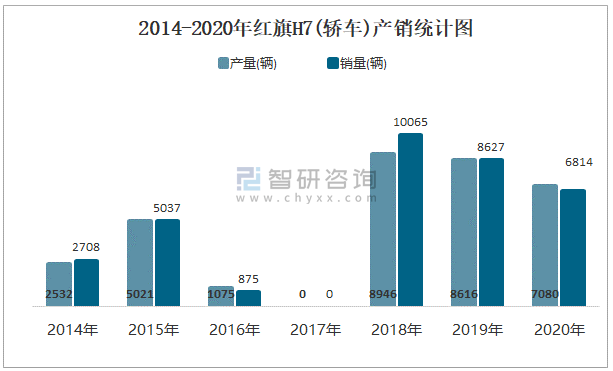 2014-2020年紅旗H7(轎車)產銷統計圖