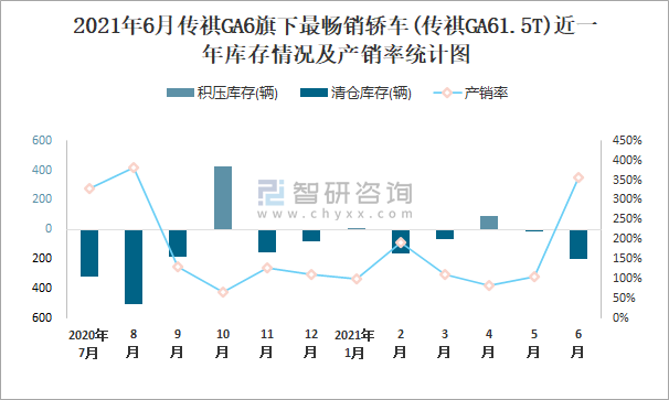 根據中國汽車工業協會數據統計可知:2021年上半年傳祺GA6(轎車)旗下只有1款傳祺GA61.5T轎車在銷售;近一年傳祺GA61.5T共清倉庫存1160輛,其產銷率存在一定幅度波動,2020年8月產銷率最高(383.15%),清倉庫存504輛,2020年10月產銷率偏低(65.9%),積壓庫存431輛。