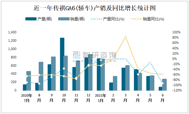 根據中國汽車工業協會數據可知:2021年6月傳祺GA6(轎車)產量為77輛,同比下降92.5%,銷量為274輛,同比下降58%,當月產銷率為355.84%;2021年上半年傳祺GA6(轎車)產量為2399輛,同比下降30%,銷量為2744輛,同比下降20.2%,產銷率為114.38%;2014-2020年傳祺GA6(轎車)產銷量均在2017年達到最高值,此后總體呈現下降趨勢,且近7年總產量大于總銷量,積壓了庫存416輛。