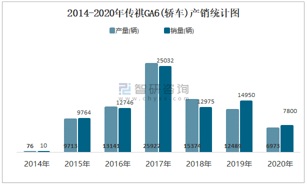 2014-2020年傳祺GA6(轎車)產銷統計圖