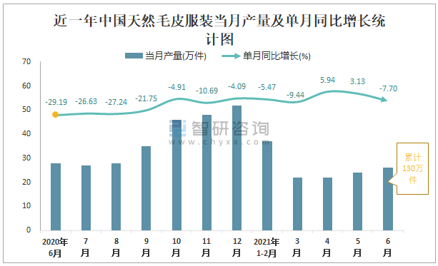2021年1-6月中國天然毛皮服裝產量為130萬件 同比下降5.75%