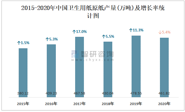 2015-2020年中國衛生用紙原紙產量及增長率統計圖