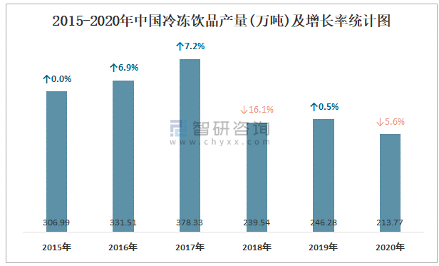 2015-2020年中國冷凍飲品產量及增長率統計圖