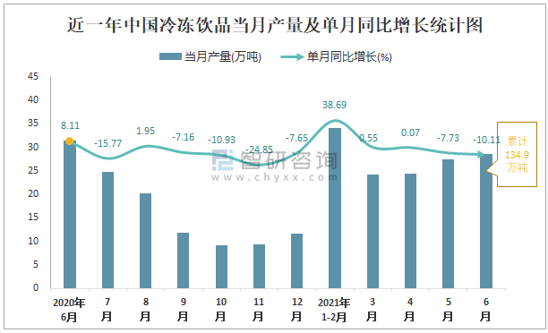 根據國家統計局數據顯示:2021年6月中國冷凍飲品產量為28.7萬噸,同比下降10.11%;2021年1-6月中國冷凍飲品累計產量為134.9萬噸,同比增長0.46%;2015-2020年中國冷凍飲品產量2017年達到最高,此后總體呈現下降趨勢。