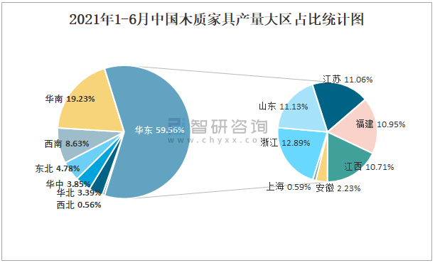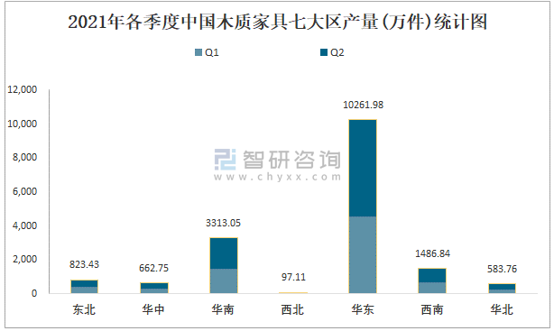 根據國家統計局數據顯示:2021年各季度中國木質家具主要集中在華東、華南、西南地區生產;2021年1-6月中國木質家具產量大區分布不均衡,其中華東地區產量最高,特別是浙江省貢獻了最多產量;2021年1-6月中國木質家具各省產量呈現梯隊式分布,廣東、浙江、山東等省產量最多。