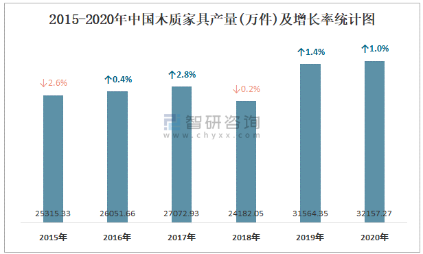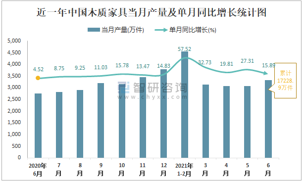 根據國家統計局數據顯示:2021年6月中國木質家具產量為3333萬件,同比增長15.89%;2021年1-6月中國木質家具累計產量為17228.9萬件,同比增長31.53%;2015-2020年中國木質家具產量2018年跌至最低值,此后呈現遞增趨勢。