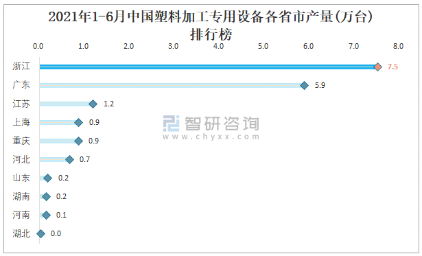 2021年1-6月中國塑料加工專用設備各省市產量排行榜