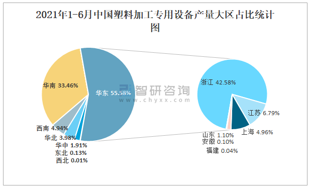 2021年1-6月中國塑料加工專用設備產量大區占比統計圖