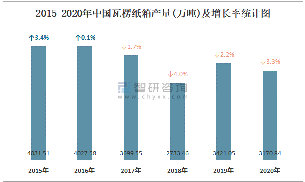 2015-2020年中國瓦楞紙箱產量及增長率統計圖