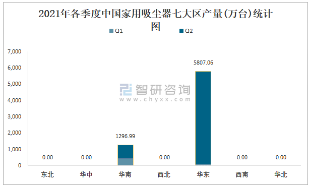2021年各季度中國家用吸塵器七大區產量統計圖