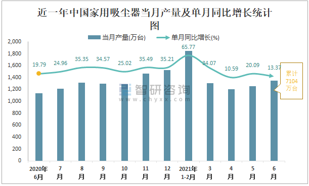 根據國家統計局數據顯示:2021年6月中國家用吸塵器產量為1351萬臺,同比增長13.37%;2021年1-6月中國家用吸塵器累計產量為7104萬臺,同比增長28.14%;2015-2020年中國家用吸塵器產量逐年遞增,2020年達到最高。