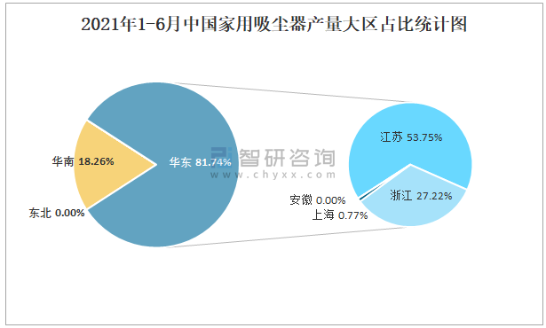 2021年1-6月中國家用吸塵器產量大區占比統計圖