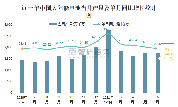 根據國家統計局數據顯示:2021年6月中國太陽能電池產量為1741萬千瓦,同比增長27.32%;2021年1-6月中國太陽能電池累計產量為9746.4萬千瓦,同比增長52.65%;2015-2020年中國太陽能電池產量逐年遞增。