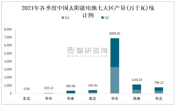 2021年各季度中國太陽能電池七大區產量統計圖