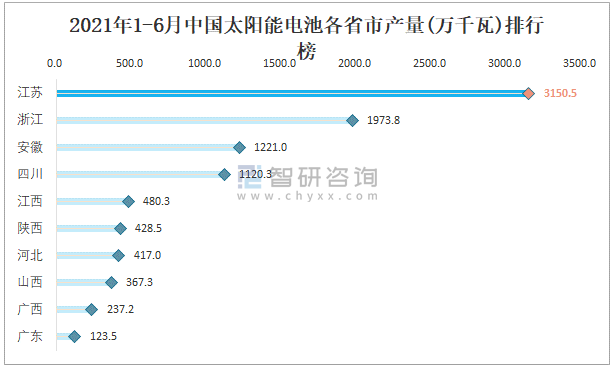 2021年1-6月中國太陽能電池各省市產量排行榜