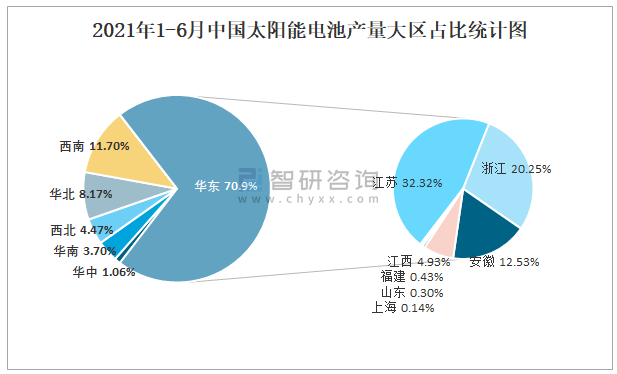 2021年1-6月中國太陽能電池產量大區占比統計圖