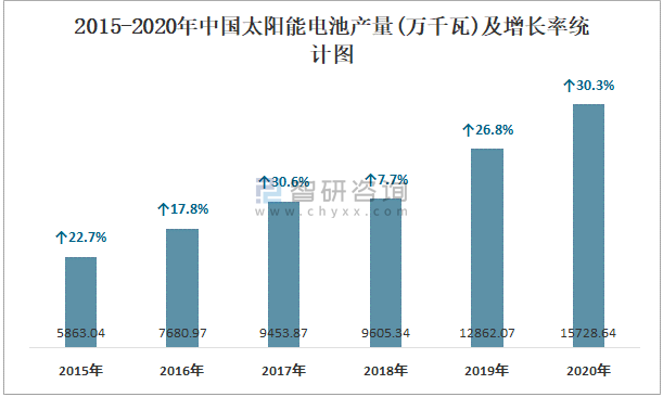 2015-2020年中國太陽能電池產量及增長率統計圖