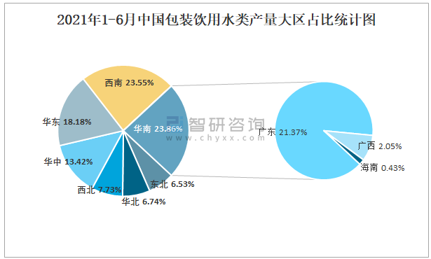 2021年1-6月中國包裝飲用水類產量大區占比統計圖