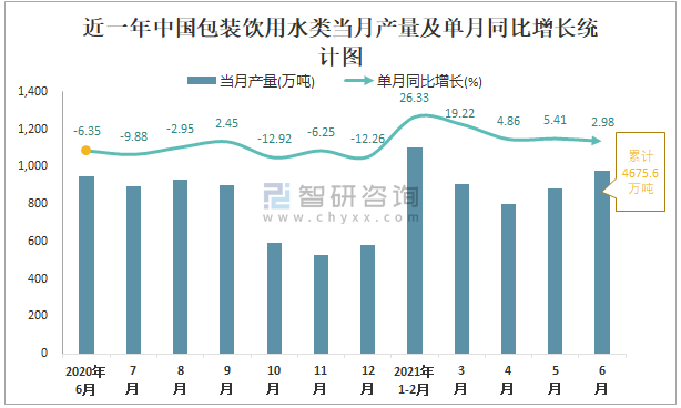根據國家統計局數據顯示:2021年6月中國包裝飲用水類產量為978萬噸,同比增長2.98%;2021年1-6月中國包裝飲用水類累計產量為4675.6萬噸,同比增長12.53%;2015-2020年中國包裝飲用水類產量2019年達到最高,次年有所下降。