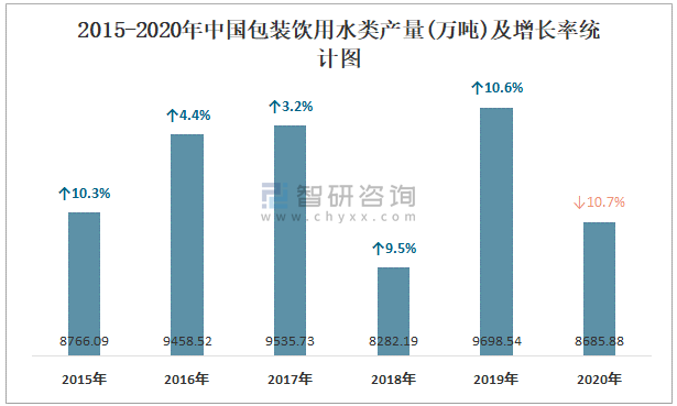 2015-2020年中國包裝飲用水類產量及增長率統計圖