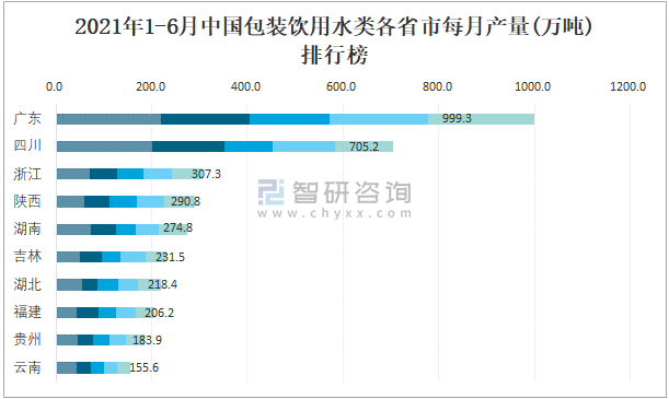 2021年1-6月中國包裝飲用水類各省市每月產量排行榜