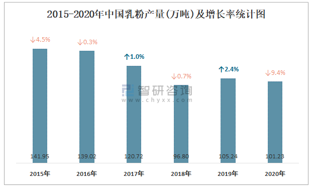 2015-2020年中國(guó)乳粉產(chǎn)量及增長(zhǎng)率統(tǒng)計(jì)圖