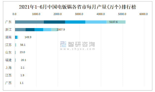 2021年1-6月中國電飯鍋各省市每月產量排行榜