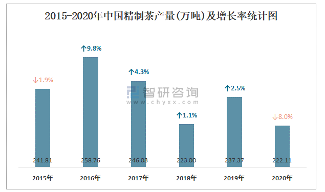 2015-2020年中國精制茶產量及增長率統計圖