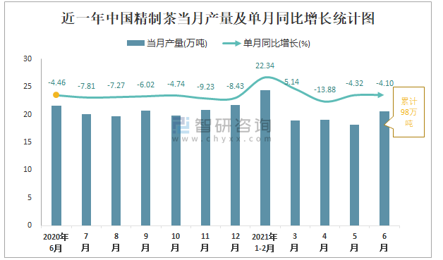 根據國家統計局數據顯示:2021年6月中國精制茶產量為20.6萬噸,同比下降4.1%;2021年1-6月中國精制茶累計產量為98萬噸,同比增長0.45%;2015-2020年中國精制茶產量2016年達到最高,此后總體呈現下降趨勢。