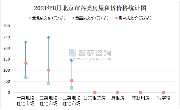 根據國信房地產信息網數據可知:2021年8月北京市7類房屋中,公共租賃房、廉租房、商業用房、寫字樓無統計數據;一類地段住宅市場租賃最低成交價、集中成交價均高于其他類房屋價格,二類地段住宅市場租賃最高成交價最高,為248.42元/m²;三類地段住宅市場租賃集中成交價約為54.26元/m²。