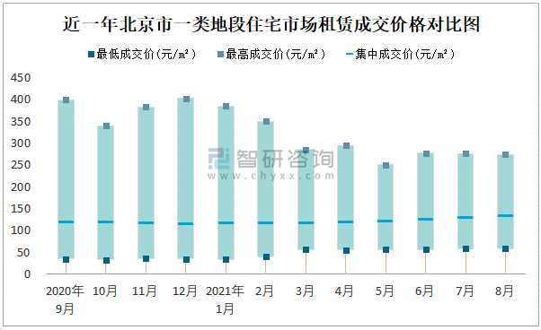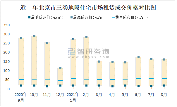 根據國信房地產信息網數據可知:近一年北京市一類地段住宅市場租賃成交價格有一定幅度波動,8月最高成交價與最低成交價差距為215.8元/m²;近一年北京市二類地段住宅市場租賃最低成交價與最高成交價的差距在225.07元/m²-443.26元/m²之間波動,今年2月差距達到最大;近一年三類地段住宅市場租賃成交價在14.81元/m²-290元/m²之間波動。