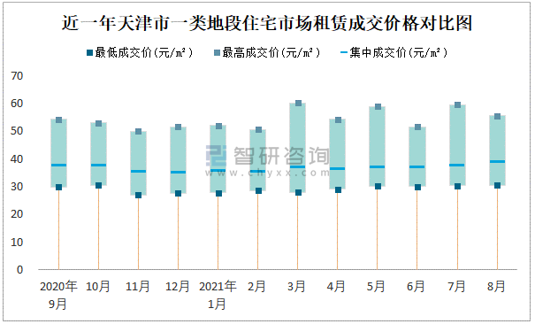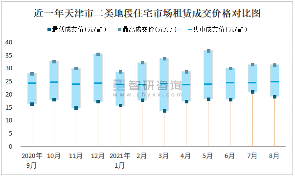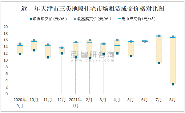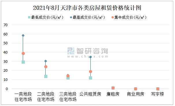 根據國信房地產信息網數據可知:2021年8月天津市7類房屋中,商業用房、寫字樓無統計數據,公共租賃房租賃集中成交價為19.02元/m²,廉租房租賃集中成交價為1元/m²;一類地段住宅市場租賃最低成交價、最高成交價、集中成交價均高于其他類房屋價格;三類地段住宅市場租賃集中成交價約為14.24元/m²。