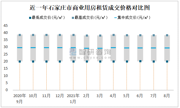 根據國信房地產信息網數據可知:近一年石家莊市商業用房租賃集中成交價比較穩定,在29元/m²-29.25元/m²之間波動,8月集中成交價為29.1元/m²;寫字樓租賃集中成交價波幅較小,在2020年9月達到最高值(29.5元/m²)。
