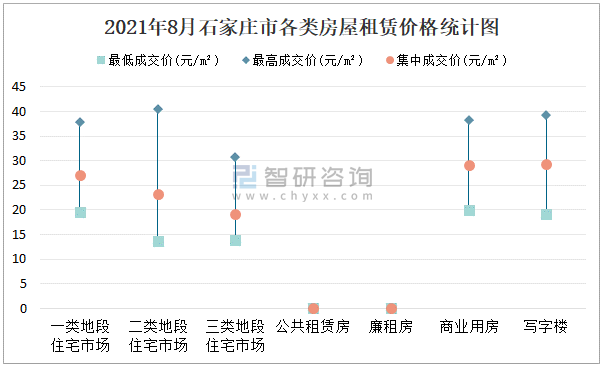 根據國信房地產信息網數據可知:2021年8月石家莊市7類房屋中,公共租賃房、廉租房無統計數據;寫字樓租賃集中成交價最高,為29.25元/m²,二類地段住宅市場租賃最高成交價最高,為40.44元/m²;三類地段住宅市場租賃集中成交價約為19.25元/m²,寫字樓租賃集中成交價高于商業用房租賃集中成交價。
