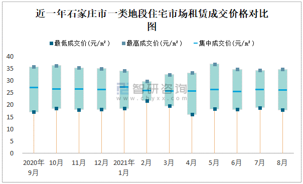 根據國信房地產信息網數據可知:近一年石家莊市一類地段住宅市場租賃成交價格有一定幅度波動,8月最高成交價與最低成交價差距為16.7元/m²;近一年石家莊市二類地段住宅市場租賃最低成交價與最高成交價的差距在15.57元/m²-30.31元/m²之間波動,今年4月差距達到最大;近一年三類地段住宅市場租賃成交價在11.7元/m²-30.66元/m²之間波動。