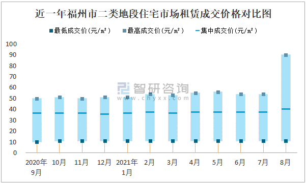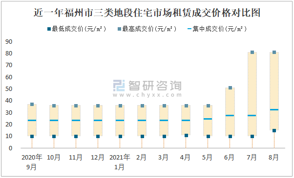 根據(jù)國信房地產(chǎn)信息網(wǎng)數(shù)據(jù)可知:2021年8月福州市7類房屋中,公共租賃房租賃集中成交價為15元/m²,廉租房租賃集中成交價為2.48元/m²;商業(yè)用房租賃最高成交價、集中成交價均高于其他類房屋價格,寫字樓租賃最低成交價最高,為26元/m²;三類地段住宅市場租賃集中成交價約為26元/m²,商業(yè)用房租賃集中成交價高于寫字樓租賃集中成交價。