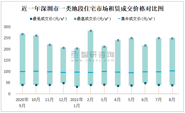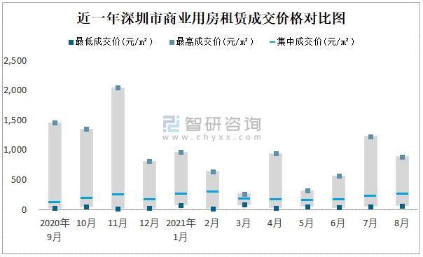 根據國信房地產信息網數據可知:近一年深圳市商業用房租賃集中成交價在114.72元/m²-293.77元/m²之間波動,8月集中成交價為261.91元/m²;寫字樓租賃集中成交價今年5月達到最高值(258.4元/m²)。