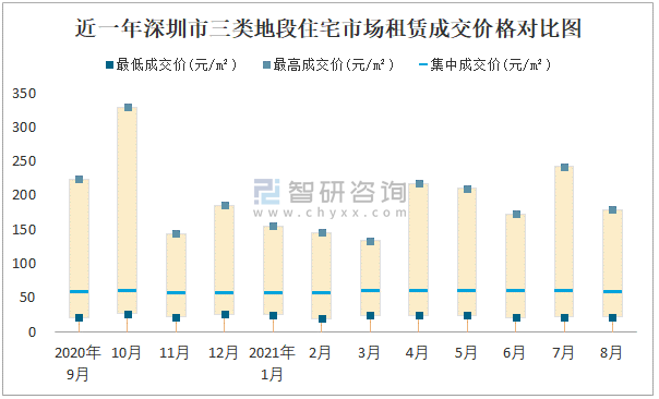 2021年8月深圳市房屋租賃市場價格走勢:一類地段住宅市場租賃價格在37.35元/㎡-202.8元/㎡之間,集中成交價約為96.37元/㎡