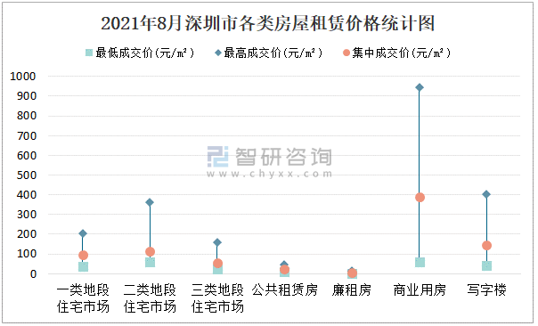 根據國信房地產信息網數據可知:2021年8月深圳市7類房屋中,公共租賃房租賃集中成交價為22.4元/m²,廉租房租賃集中成交價為7.45元/m²;商業用房租賃最高成交價、集中成交價均高于其他類房屋價格,二類地段住宅市場租賃最低成交價最高,為59.94元/m²;三類地段住宅市場租賃集中成交價約為56.59元/m²,商業用房租賃集中成交價高于寫字樓租賃集中成交價。